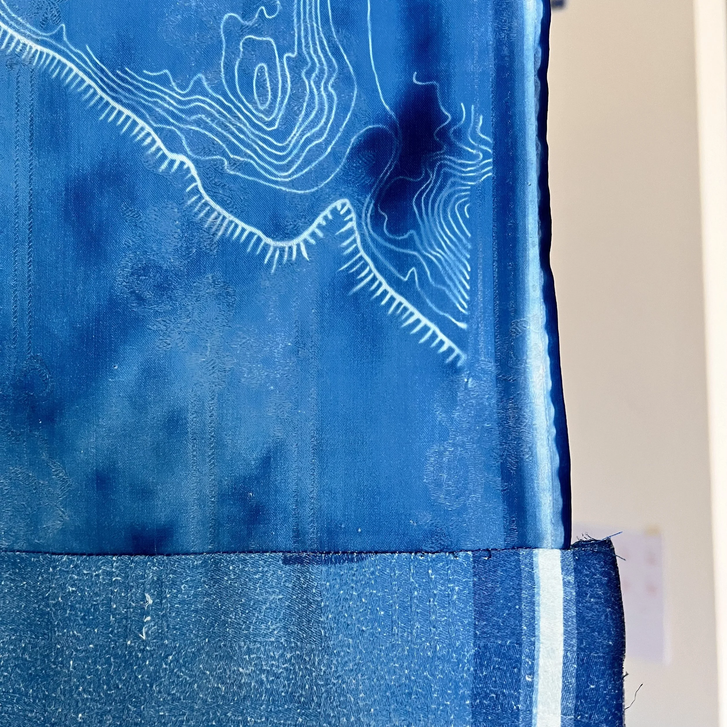 Each of the panels starts from a topographic map. For this project I am tracing only the 10-meter contours and the current path of the Upper Rhine as it travels from Switzerland, and then between France to the west and three German states to the east and north. The resulting drawing is then transferred via cyanotype onto white damask fabric. Sourced from second-hand stores, this material – once bed and table linens – is connected as intimately as possible with the people and the place that I now call home. The technique, an early form of photography which relies on simple iron compounds and sunlight, was used by Anna Adkins in 1843 to produce the first photographically illustrated book. The process is watery, variable, and somewhat unpredictable, like the conditions encountered by engineer Johann Tulla and the 19th century laborers who straightened the Rhine. What is revealed is not a complete documentation of the river and the floodplain – it is an abstraction, contrasting the straightened channel with its dams and harbors against the traces of the old paths of the river.